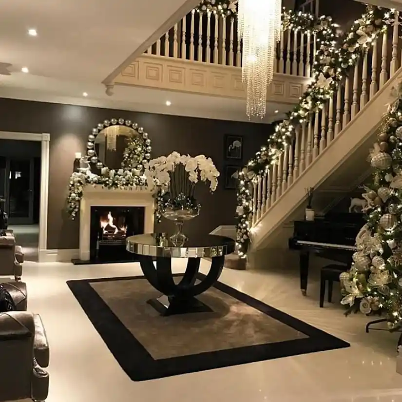 If you love a little glam, here you go. Thick garlands sweep the banister and sparkle with champagne ornaments. Overhead, a crystal chandelier sets the tone, and a mirrored center table doubles the lights. The fireplace wears a round mirror and matching garland for balance.