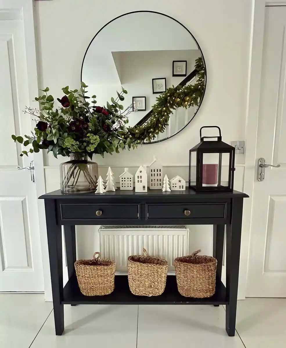 One black hall table under a large round mirror can do everything. Style it with a winter bouquet, a row of little ceramic villages, and mini trees in different heights. Stash woven baskets beneath to hold hats and slippers. Practical storage still looks festive when it’s symmetrical and tidy.