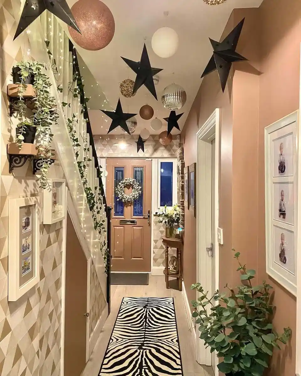 Paper stars and globe ornaments float overhead like a tiny planetarium. A trailing stair garland and twinkle lights connect the ceiling to the floor so it doesn’t feel random. A zebra runner pops against peachy walls and geometric wallpaper.