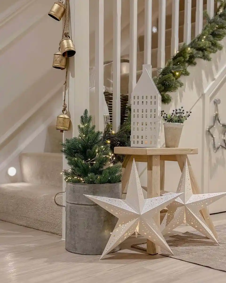 Create a moment where people actually want to pause. Hang brass cowbells from the newel post for soft jingle. Add a galvanized bucket with a tiny pine and tuck micro lights into the branches. Paper star lanterns rest near a small stool topped with a ceramic house. A soft garland climbs the railing.