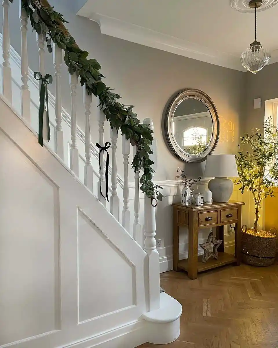 If you love timeless style, drape a thick magnolia-style garland down a white staircase and knot slim velvet ribbons in deep green and black. Across from it, a wood console with a round mirror and a stone lamp keeps the palette rich and simple. Add tiny ceramic houses for twinkle.