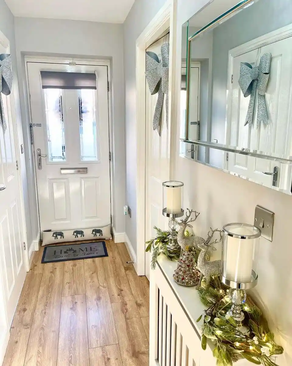 A bright compact hallway can still look dressed. Silver glitter bows on the interior doors echo glass hurricanes and reindeer figurines on the radiator cover. A petite lit wreath centers the space, while a neat strand of greenery frames the vignette.