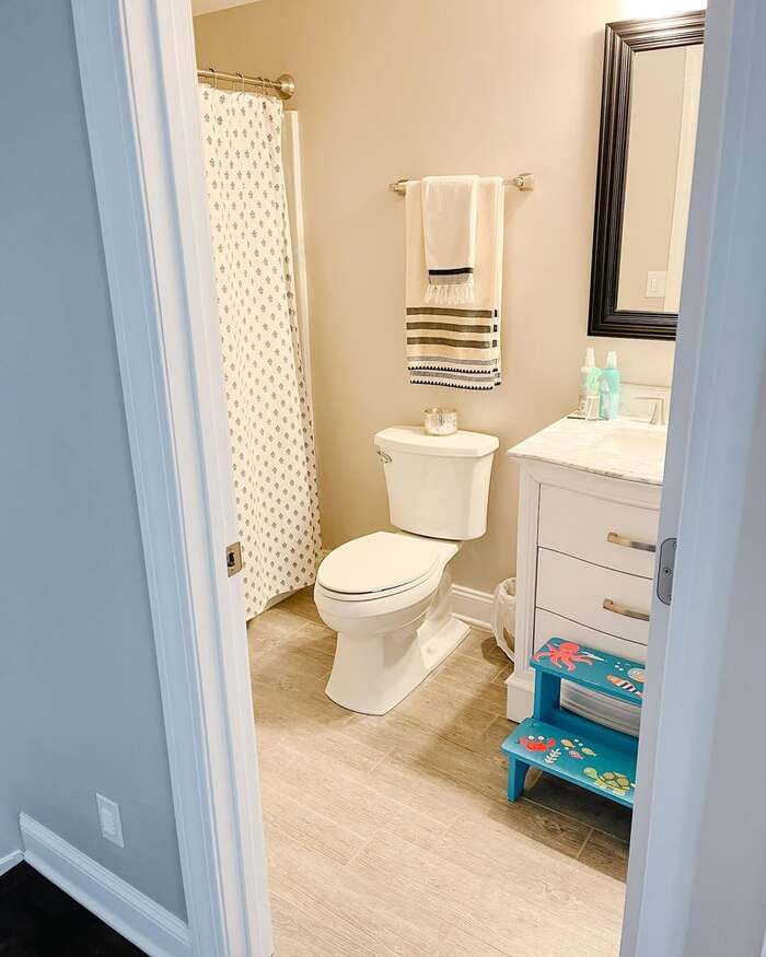Not every space needs fireworks. This soft beige room with a cute step stool is the reset button in my list of kid bathroom ideas. Starter homes, rentals, tight budgets, I see you.