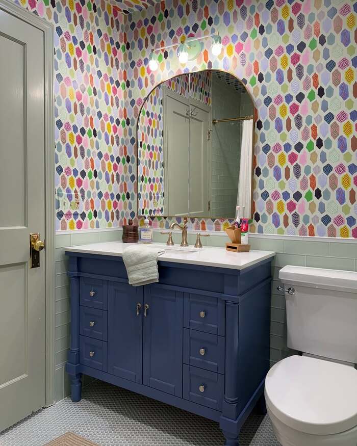 Bold multicolor wallpaper meets a deep blue vanity, then everything else chills out.