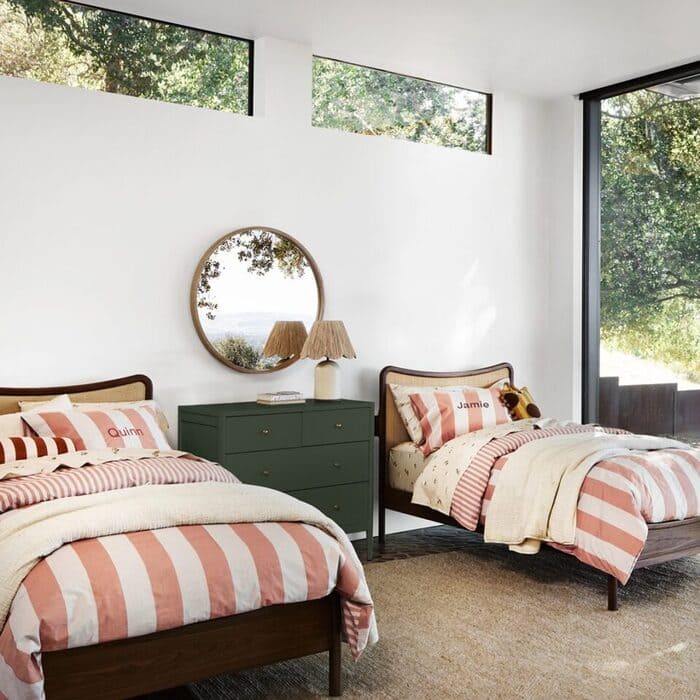 The clean twin setup with striped duvets and names on the pillows is a reminder that simple is powerful. If you want a fast weekend refresh, do matching duvet covers, a single dresser in a contrasting color, and a round mirror. Mirror bounces the window light and makes mornings less zombie, promise. Sewing skills not required.