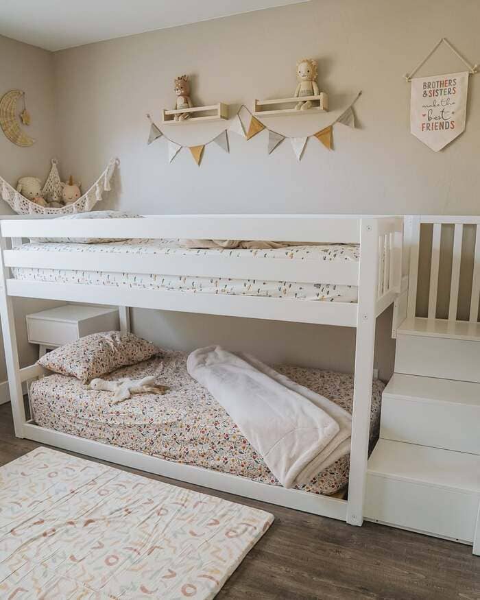 If you can, add a rail with round balusters on the top bunk. They feel friendly and photograph cute, which weirdly makes kids keep the space nicer.
