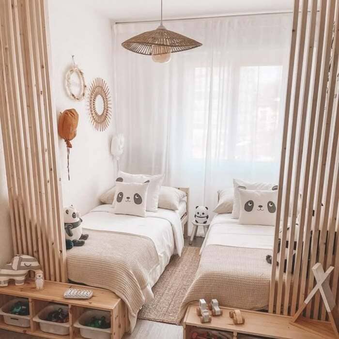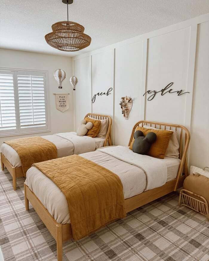 That room with the wood slat panels between two twins is my peace treaty layout. It gives each side a sense of “mine” without building a wall. Slide a narrow jute runner down the center so nobody argues about the edge. Use low toy cubbies at the foot of both beds and hide plastic bins inside.