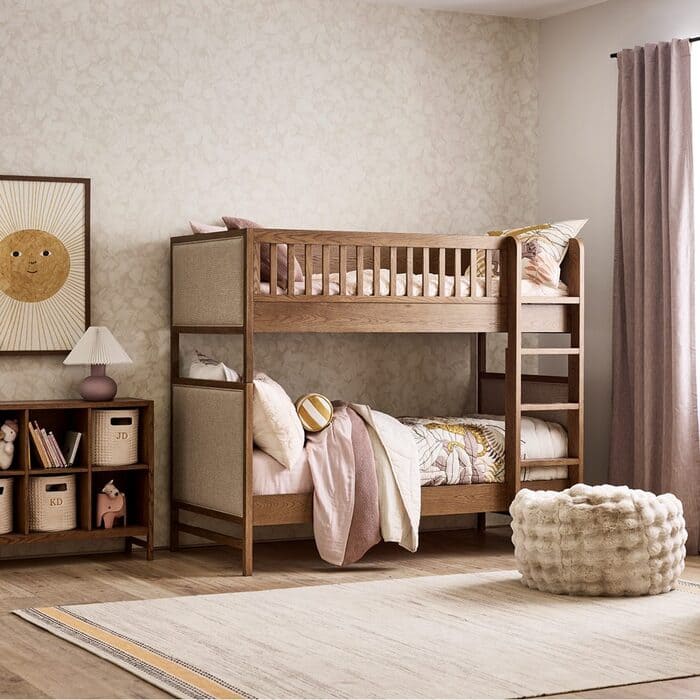 The oak bunks with fabric panels are gentle on the eyes. Texture is the secret. Linen duvet, boucle ottoman, woven curtain, and the room feels calm even when the Lego bucket is out.