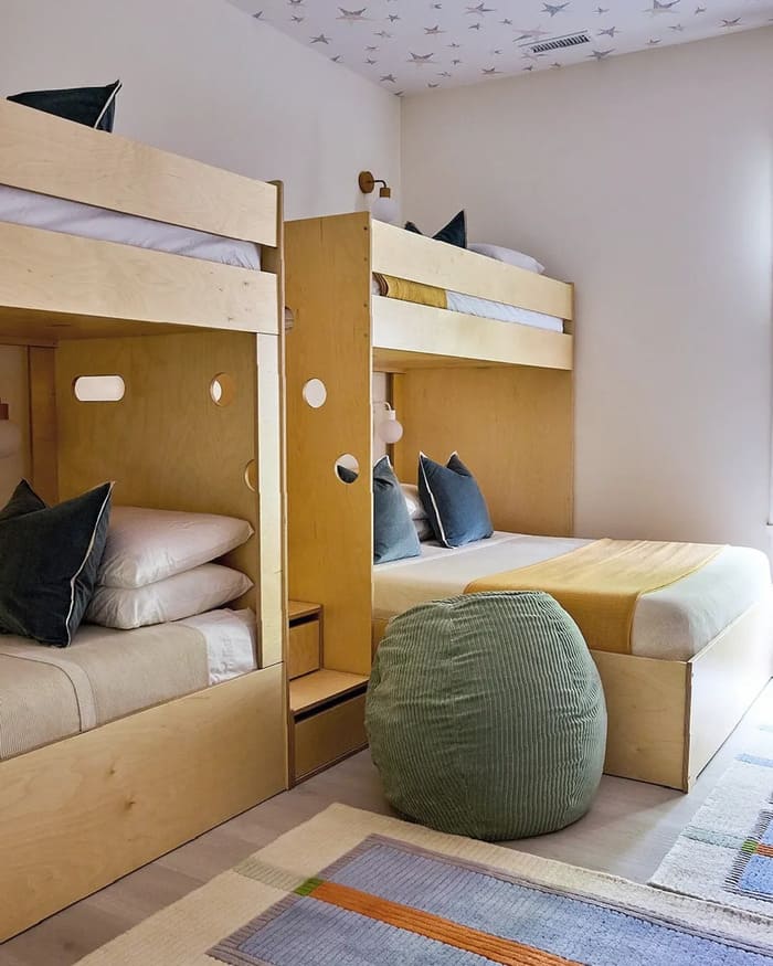 The plywood bunks with circles and built-in steps are sleepover heaven. Use marine-grade plywood if you can, it sands smooth and holds up. Pocket lights at shoulder height let each kid read without bothering the other.