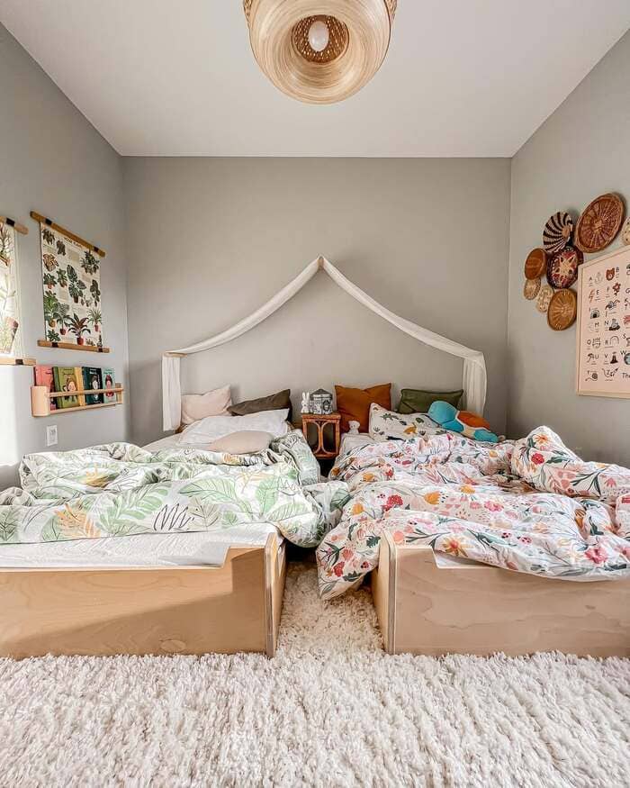 Those two low beds with the little canopy rail in the corner, so good for toddlers or early elementary. Low beds make mornings calmer, because they can make the bed by themselves, kind of, and it still looks okay.