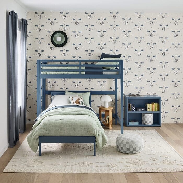 Blue loft up top, standard twin below, this layout saves the friendship when sleep styles are different. The night owl goes up high, the early bird gets the lower bed near the lamp. Put a wall puck light at shoulder height for each kid. I mount them with 3M strips so I can move them if they change sides.