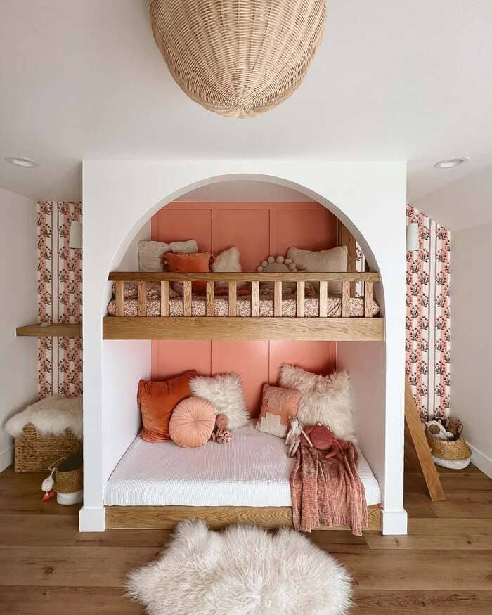 That sweet arch bunk with peach panels, warm wood, and soft blankets gave me a design crush. The reason it works is simple color blocking. Pick one wall color, one wood tone, and two soft accents. Here it’s peach and white with natural wood and creams. Keep toys in seagrass baskets, yes, the ones in the picture, because the texture hides chaos.