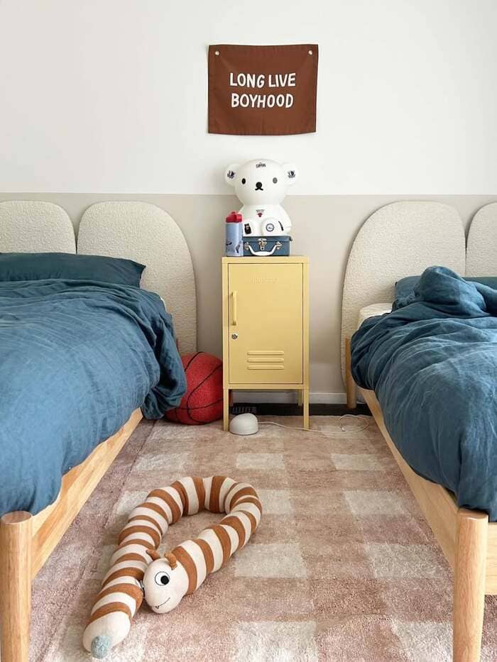 Two twins with the tiny yellow locker in the middle might be my favorite practical move. A shared nightstand stops the “that’s my outlet” fight. I use a small metal locker too, because the doors shut and you can wipe markers off.