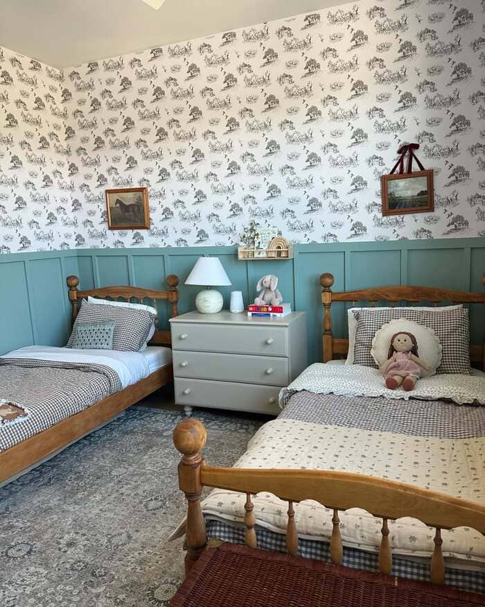 There’s a room with toile wallpaper and teal wainscoting that looks like grandma’s cottage, in the best way. If your house has older furniture, lean in. Mix gingham sheets with a modern rug so it doesn’t read dusty.
