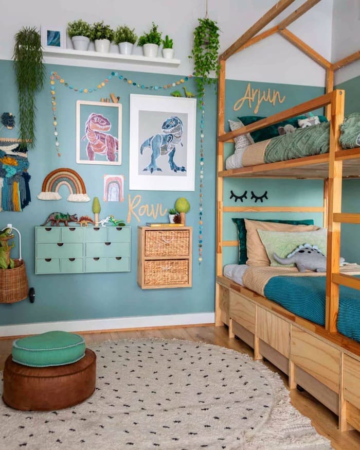 The teal wall with hanging plants and the kids’ names cut from wood, that’s how you personalize and still keep order. Names above each bunk are more than cute. They tell every basket and shelf where things belong.