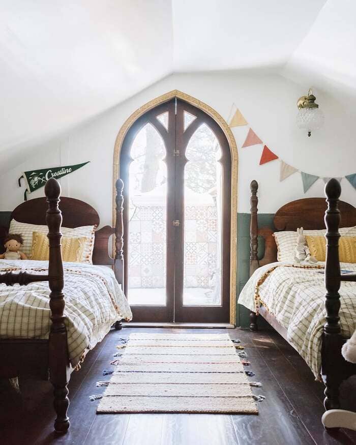 That attic room with the gothic doors and two antique beds made me grin. When your room has weird angles, put the beds parallel, not perpendicular, so you keep a walkway in the middle for laundry baskets and toy strollers. Hang a pennant or simple bunting to follow the roofline.