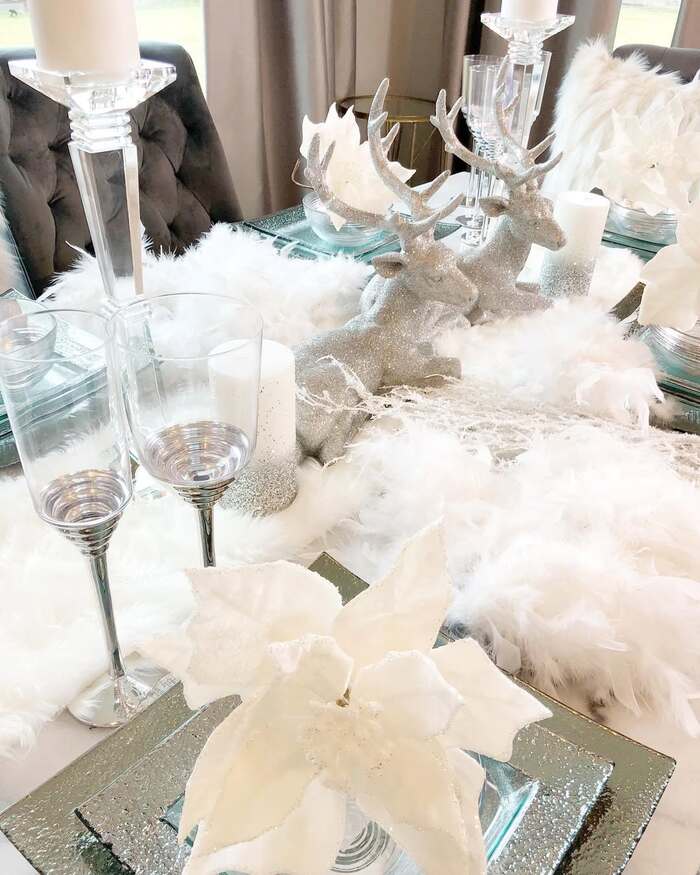All white, all shine, real drama. A fluffy faux-feather runner, glitter deer, crystal candlesticks, and glossy chargers. Is it practical? Not really. Do I love it anyway? Totally. It’s theatrical and makes everyone’s eyes light up. If you want holiday table centerpiece drama for an evening party, play here.