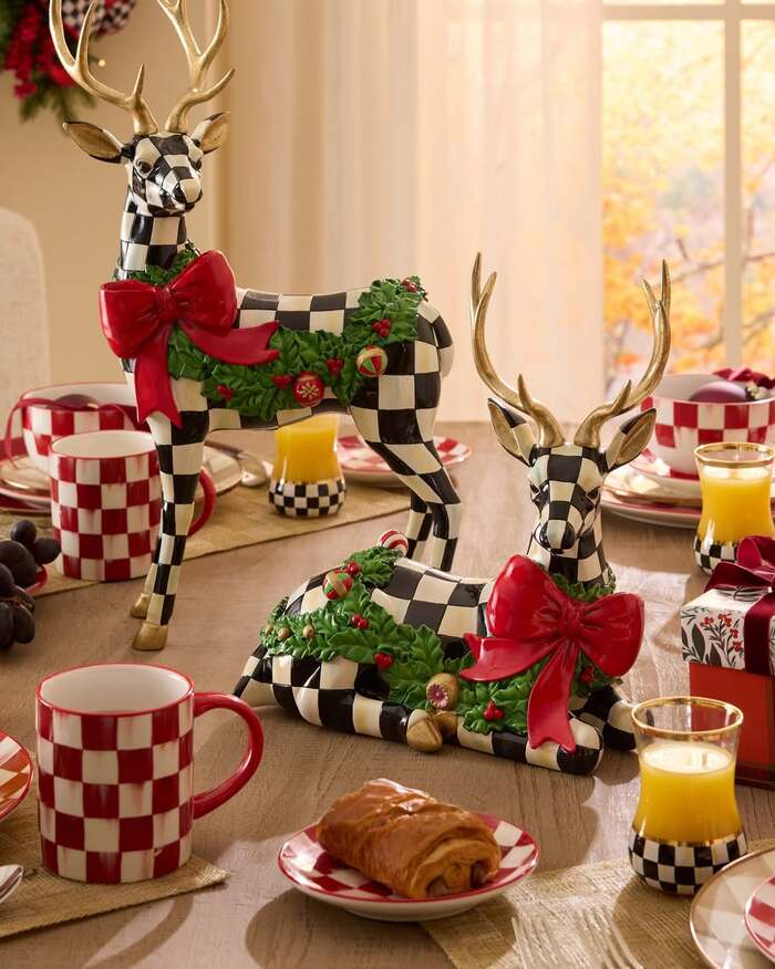 These checkered reindeer are dramatic and a little cheeky. Paired with checker mugs and red-rim plates, the whole table feels like a playful candy shop. I love this for brunch when the sun hits those glossy antlers. The red bows and green wreaths on the deer mean your centerpiece does the heavy lifting. Guests notice it first and smile. That’s the goal with Christmas table decor ideas.