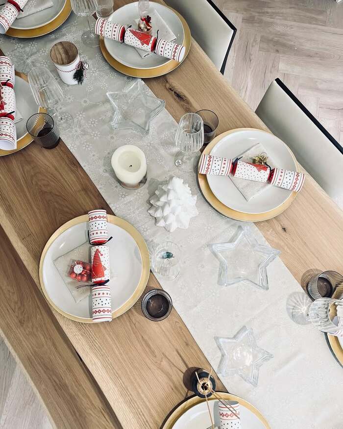 This layout is neat and soft. Think white plates with thin gold rims, a pale snowflake runner, and star-shaped glass bowls that catch candlelight. The star dishes make me oddly happy. Add crackers on each plate for a tiny tradition. If you like kitchen Christmas centerpiece moments that don’t block conversation, this is your friend.