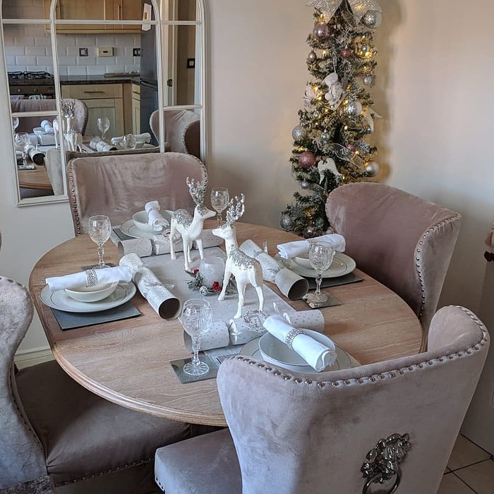 Cozy glamour, but gentle. A round wood table, soft beige napkins, and two white reindeer in the middle. There’s a slim tree in the corner for extra sparkle. I love round tables because conversation just flows better. If you want kitchen table festive decor that still feels grown up, this is a sweet path.