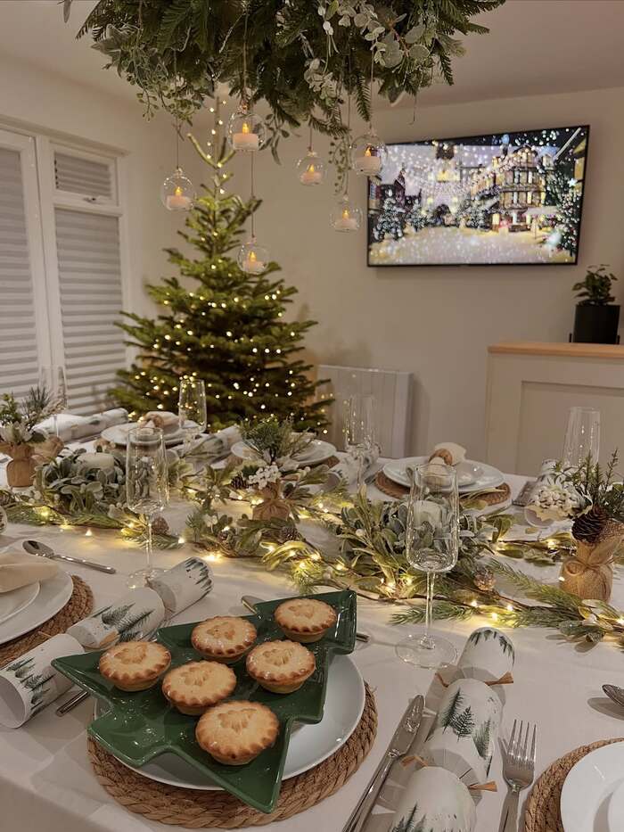 This table glows. A garland runs down the center with warm fairy lights tucked deep, and a cluster of mini arrangements in burlap bring height. Above, a hanging ring of greenery with glass baubles floats like snow. The plates sit on woven chargers for warmth, and a tree-shaped server holds little pies. If you want tabletop holiday decor that makes guests whisper wow, start here.