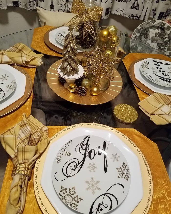 Balance is everything. I used plaid napkins with warm caramel tones to break up the shine, then added a few pinecones so the gold doesn’t float. A round lazy Susan under the centerpiece makes sharing sides easy. Add glass cylinders with ornaments to fill space without clutter. Keep drinkware clear so it doesn’t fight the plates. The neat part with this look is how it photographs at night. Candlelight makes the script plates glow. It’s the loudest member of my 10+ kitchen table christmas decor family and she is absolutely invited.