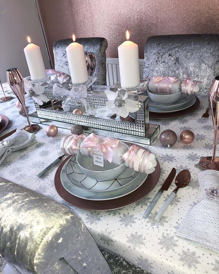 To keep it from feeling icy, bring in a warm metal. I used rose-gold flatware, which bridges blush and silver. Place small blush ornaments randomly on the tablecloth for a scatter of color. Use unscented candles so they don’t fight the food. Mirror pieces show fingerprints, so wipe with a microfiber right before guests arrive. This setting is the easiest way to pull off Christmas table decor that feels boutique. And with the bows on crackers, it photographs like a magazine even if the dog is asleep under the table.