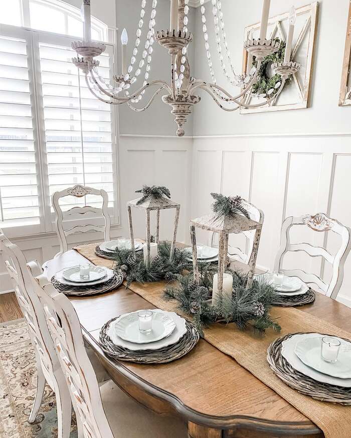 This is whitewashed heaven. A burlap runner, simple white plates on woven chargers, and rustic lanterns stuffed with candles and greens. It’s calm, breezy, and very forgiving for a busy December. If you want a holiday kitchen tablescape that you can set once and leave all season, this is it.