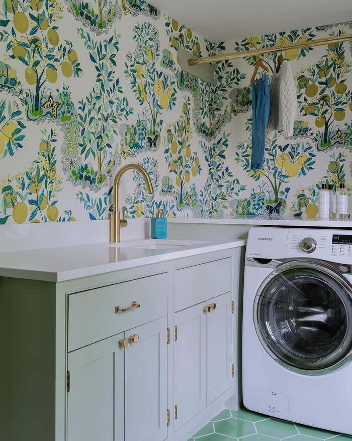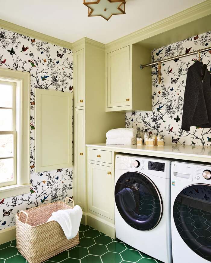 That botanical wallpaper dotted with butterflies feels cheerful even on laundry day. The soft chartreuse cabinets echo the leaves, and those minty hex tiles on the floor make the whole room sing.