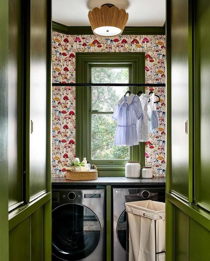 This laundry room makes me smile every single time. The happy mushroom wallpaper is quirky and sweet, and the deep olive trim keeps it from feeling like a kids room. I’ve used this trick for clients who love playful prints. Frame the fun with a serious color so it reads stylish, not silly. The scalloped ceiling light, woven tray, and black countertop pull the whole palette together.