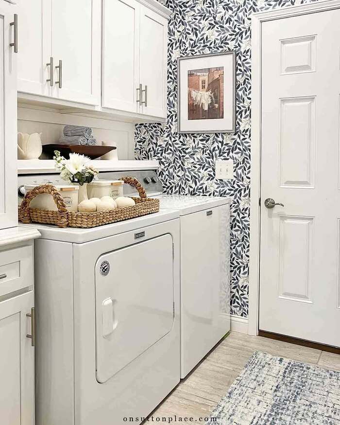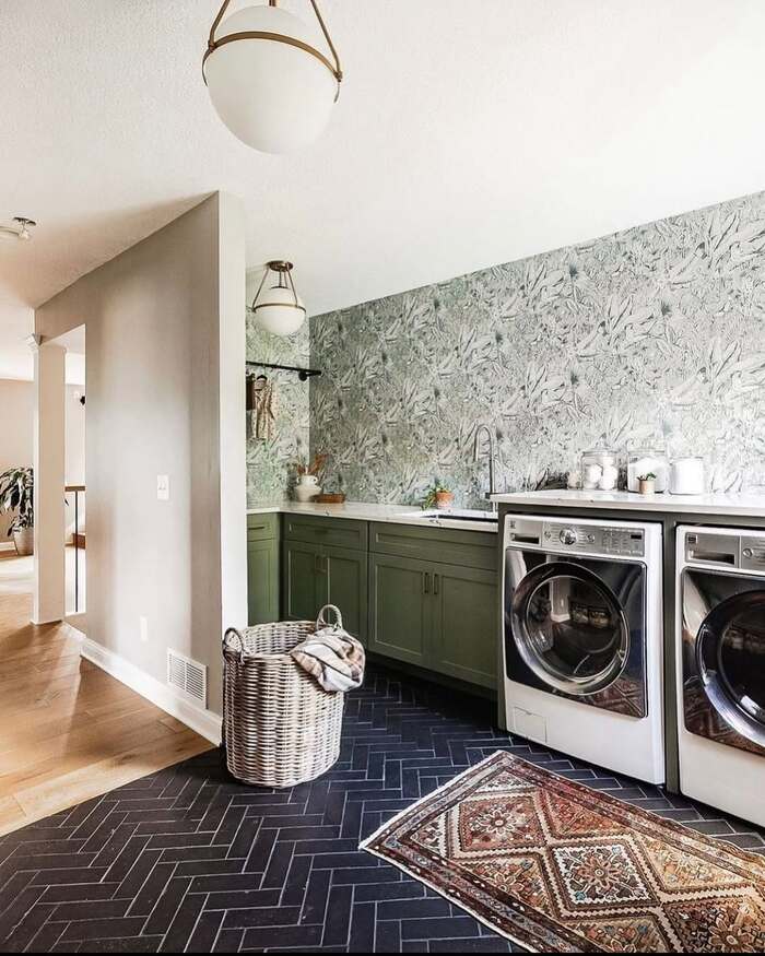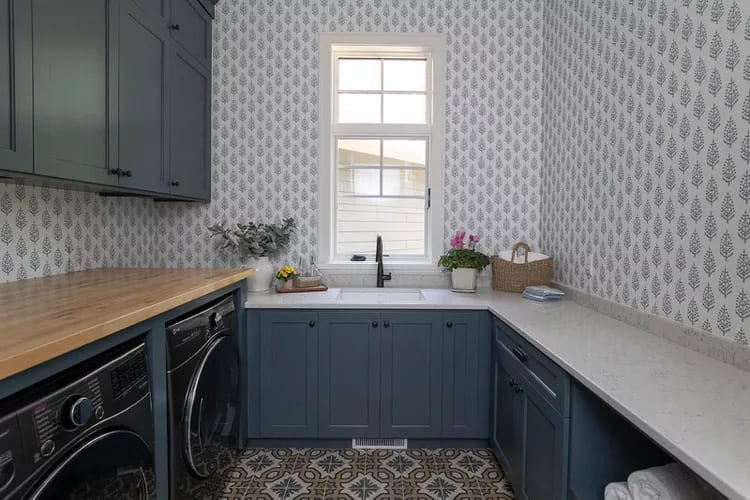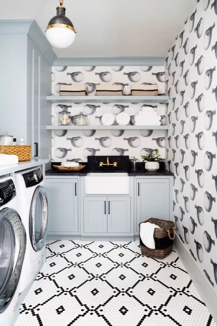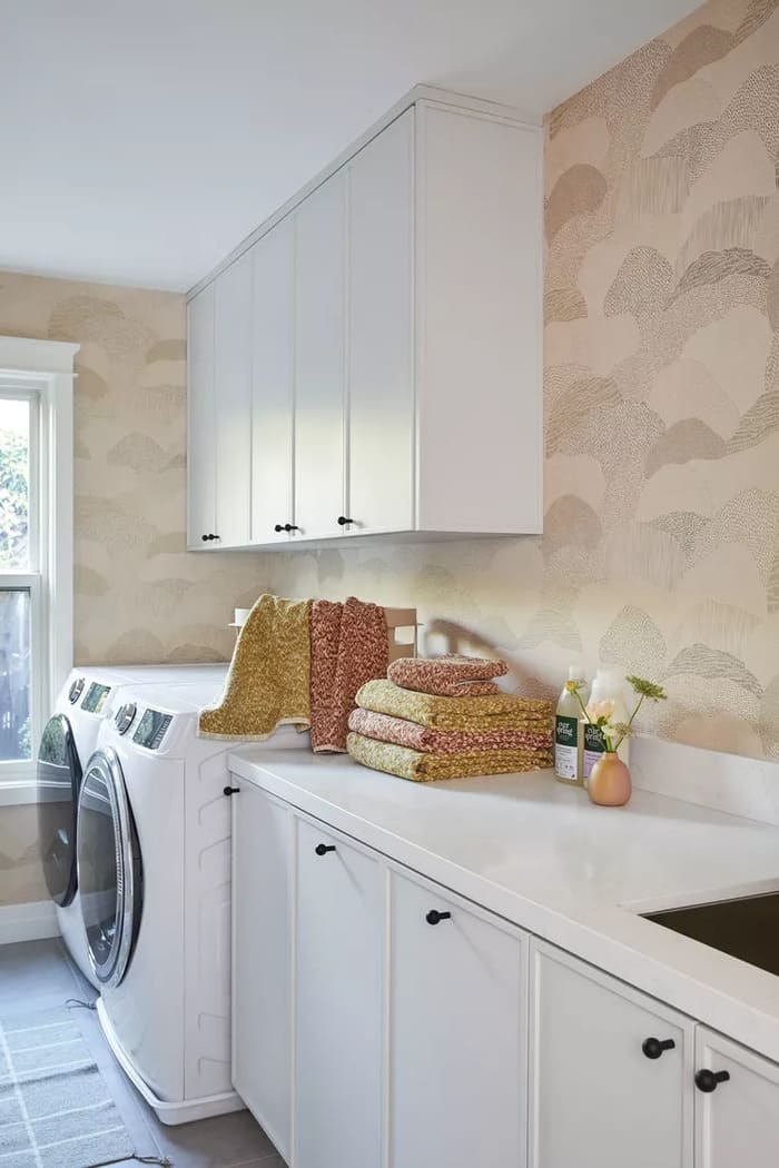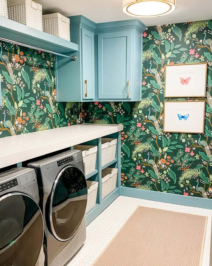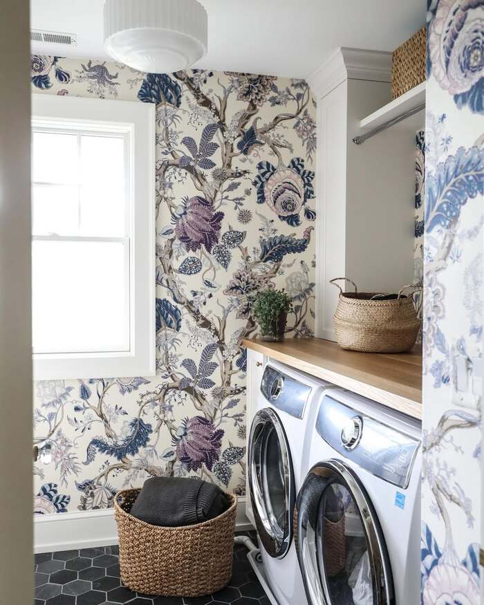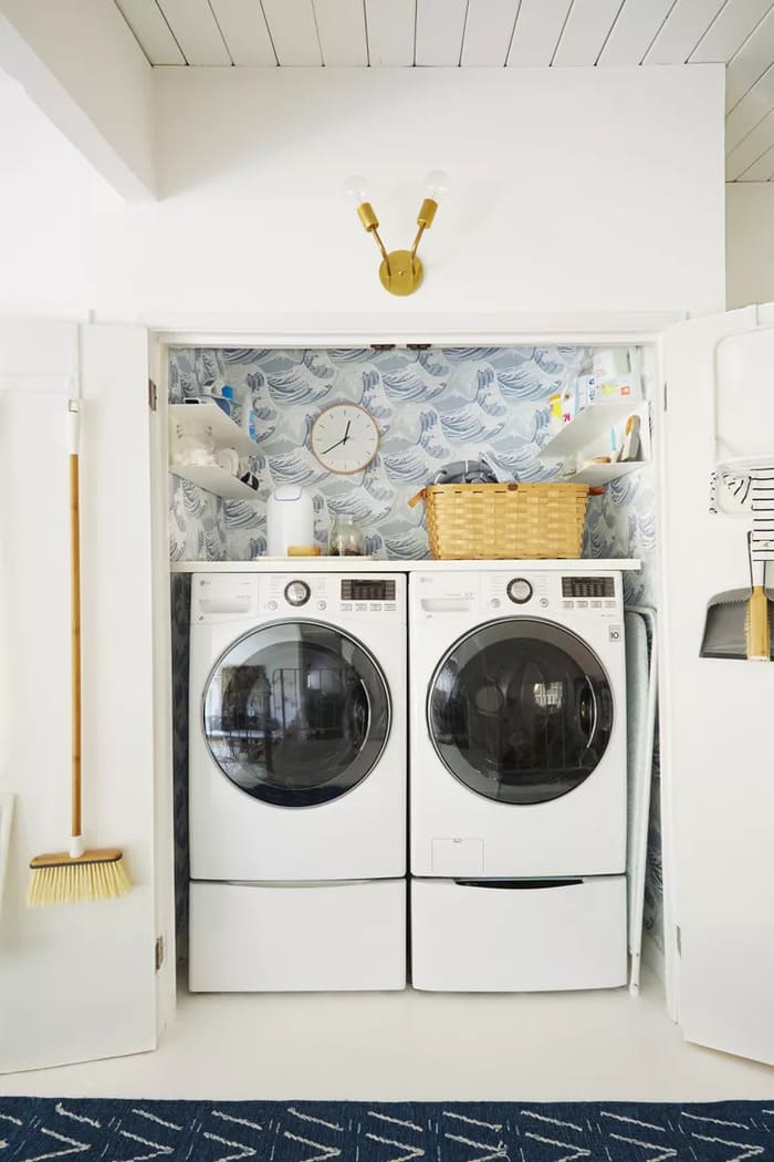 This is proof you don’t need a full room to have style. A closet laundry can still feel joyful with a single accent wall of wave wallpaper. The white machines pop, the little clock is adorable, and baskets keep the mess at bay. I’ve done similar in rentals with peel-and-stick paper. It goes up in a morning, comes down without drama.