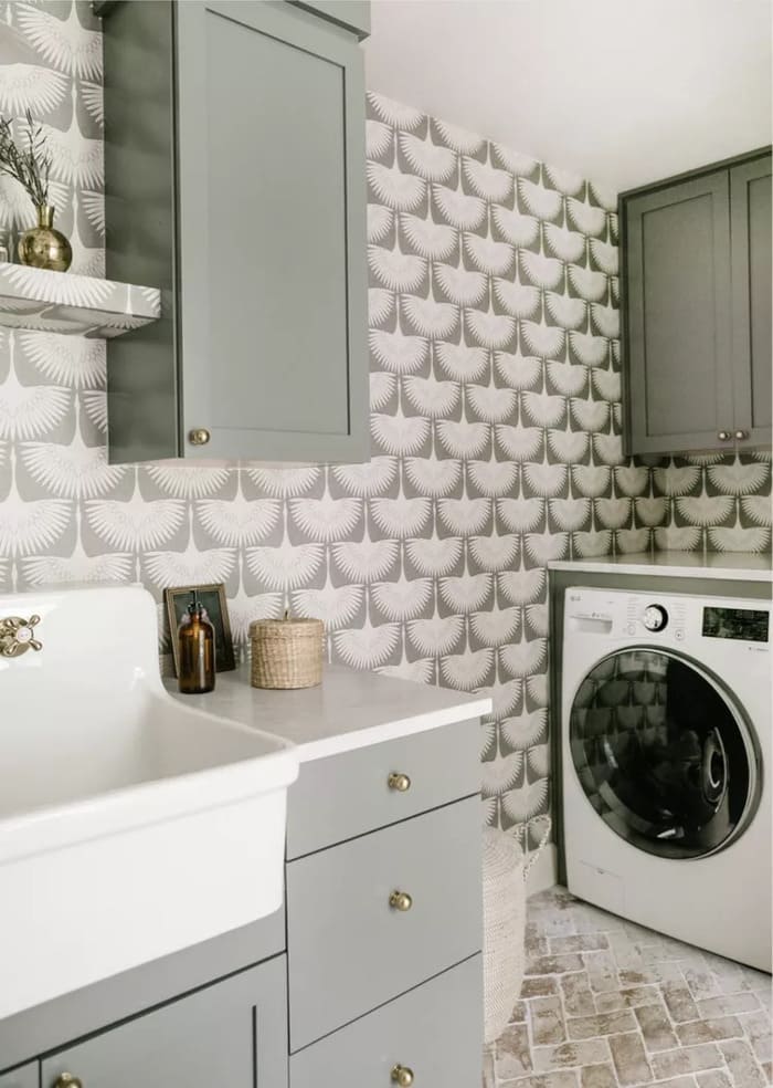 Large-scale repeats look amazing in small spaces if you keep the color story tight. These pale gray fan shapes are airy and modern, and the aged brick floor brings texture that makes the room cozy. I’d happily fold towels here for way longer than needed, which is saying something because I’m not a towel-folding person by nature.