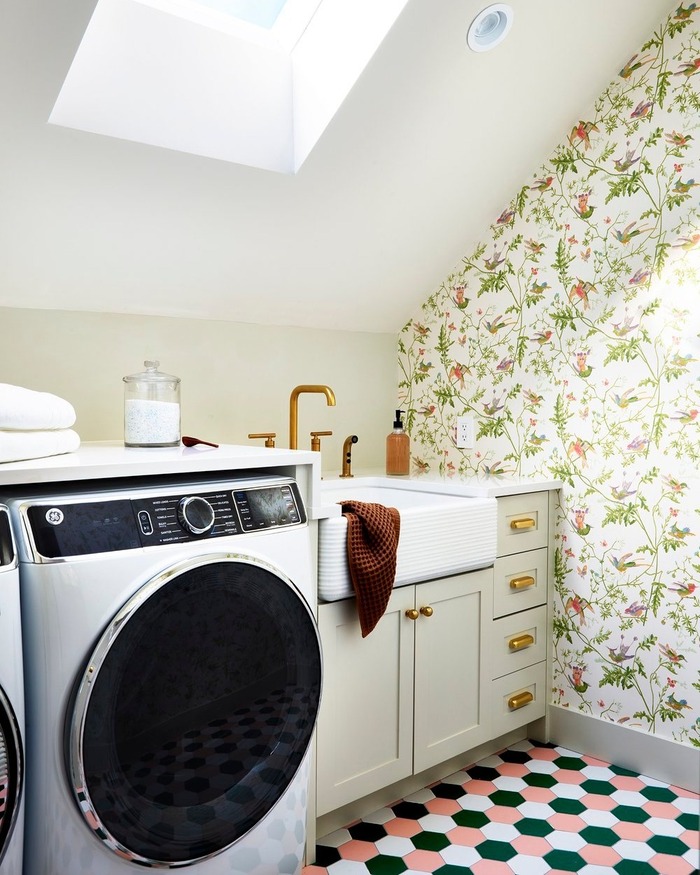 Bright, happy, citrus. The large-scale repeat is brave but balanced by quiet mint cabinets. Gold hardware ties into the sunny yellow for a clear story. Keep the counters white so all those colors feel fresh, not heavy. If you have a windowless laundry, pick a fruity or garden print like this and use warm bulbs. Instant daylight vibe.