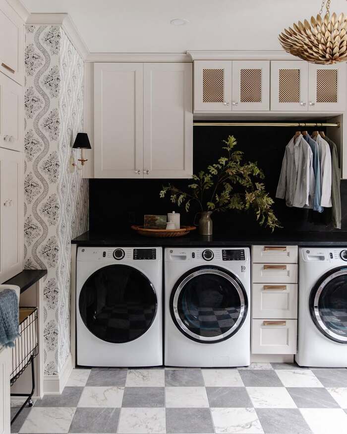 Double washers along a dramatic black backsplash feel fancy, but the wallpaper and gray-check floor keep it friendly. Notice the small black sconce that kisses the print. Good lighting makes sorting not miserable. Add a brass rod for hang-dry items and place a shallow tray for pocket junk. My client calls it the marble graveyard. We all need one.