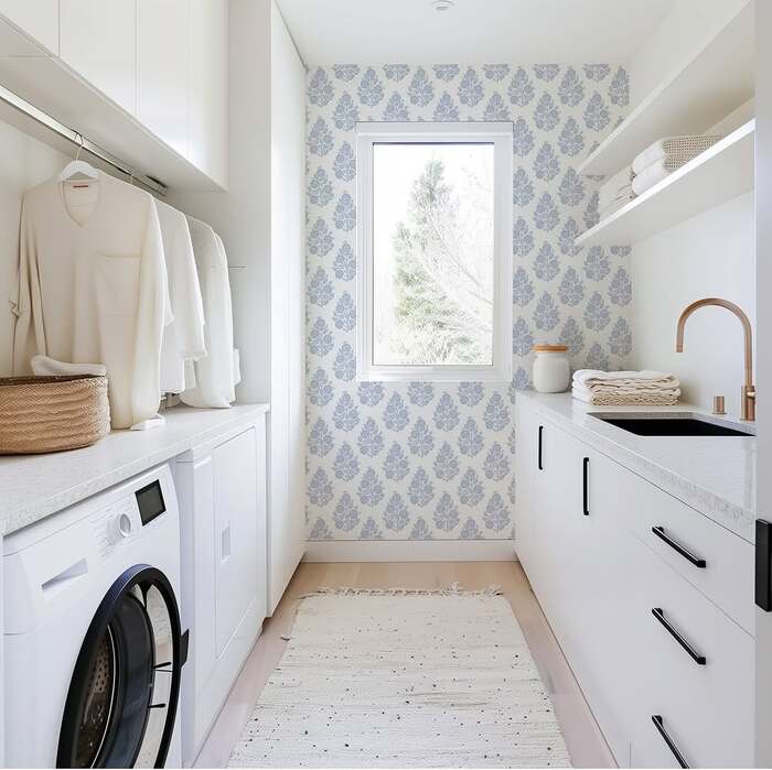 This crisp space proves pattern can be clean not fussy. The leaf wallpaper is mid-scale, so it hides splashes and won’t date fast. I’d copy the long shelf over the washer for baskets and decanters.