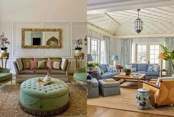 Idea fifteen feels like a classic formal living room with a modern twist. The light flooring living room tiles here have a soft golden tone that makes the space feel rich. The furniture is traditional with curved arms and carved legs, but the black coffee table and black-striped throw pillows add just enough contrast to keep it modern.
