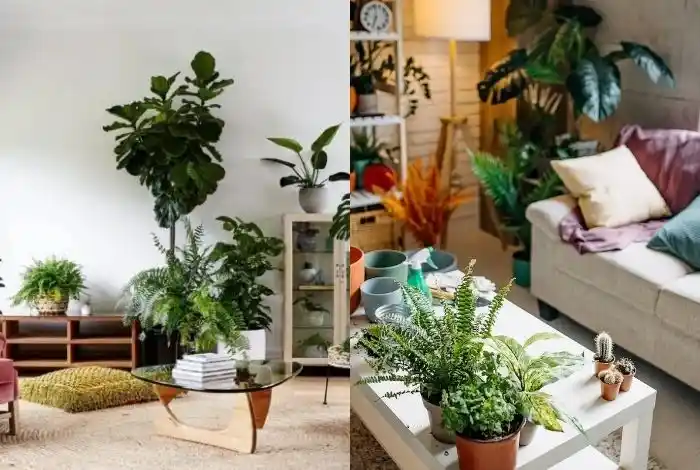 The side detail with the indoor plants is genius. Having greenery right at sofa height keeps the neutral palette from feeling boring. If you love a modern light tile living room floor, plants are the easiest way to break up all the beige and cream. Even a small row of potted plants can mimic that built-in planter vibe.