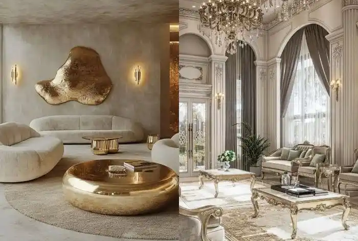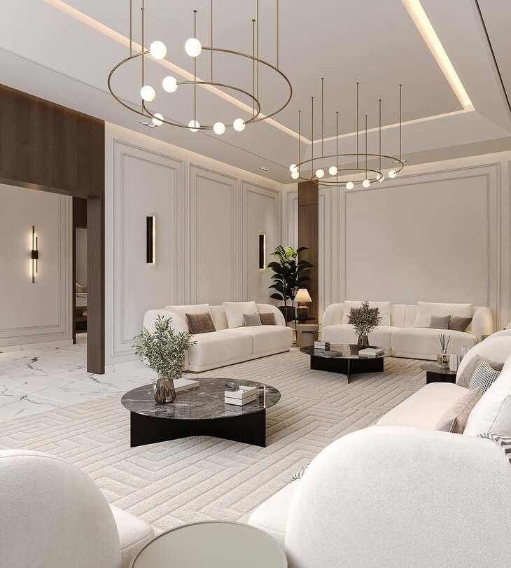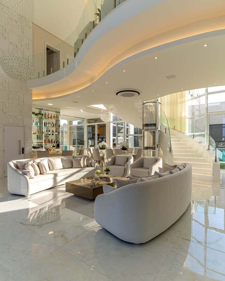 The second photo feels like someone put a five-star resort in their house. Everything is curved: the staircase, the sofas, even the glossy marble floor pattern. This is another light flooring living room, but here the tiles are almost mirror-like. They reflect the sunlight and the gold ceiling strip lighting so the room glows without any extra decor.