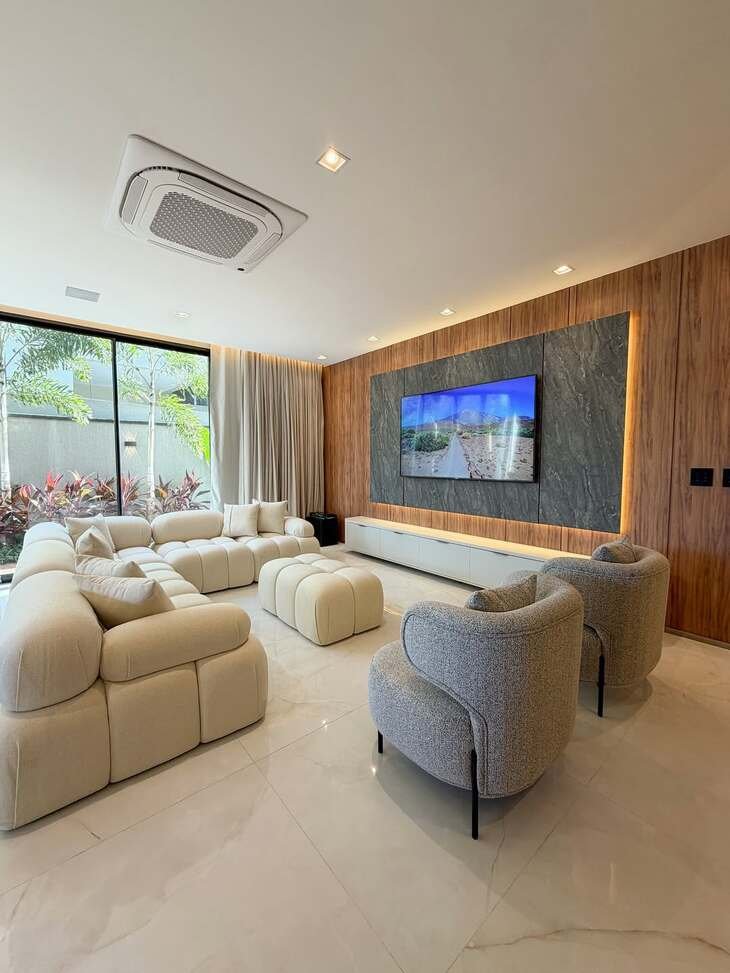 The tenth room is the one that made me say “ok, this is the dream.” It is a large light flooring living room, but it feels relaxed and family friendly. Chunky modular sofas sit on a glossy cream floor, facing a wood and stone TV wall. Two curved armchairs add extra seating without blocking the view.