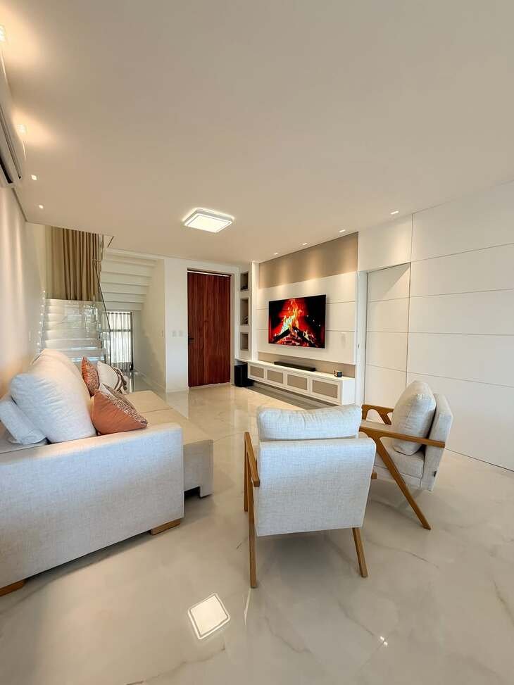 The seating layout pulls the room together. Instead of crowding the middle, the chairs and sofa face a sleek built-in entertainment wall with a fake fireplace on the screen. I kinda laughed at first, but honestly it adds warmth without the mess. I would totally steal that trick for any modern living room with light floors. When your flooring is shiny, little pops of glow or color balance all that brightness.