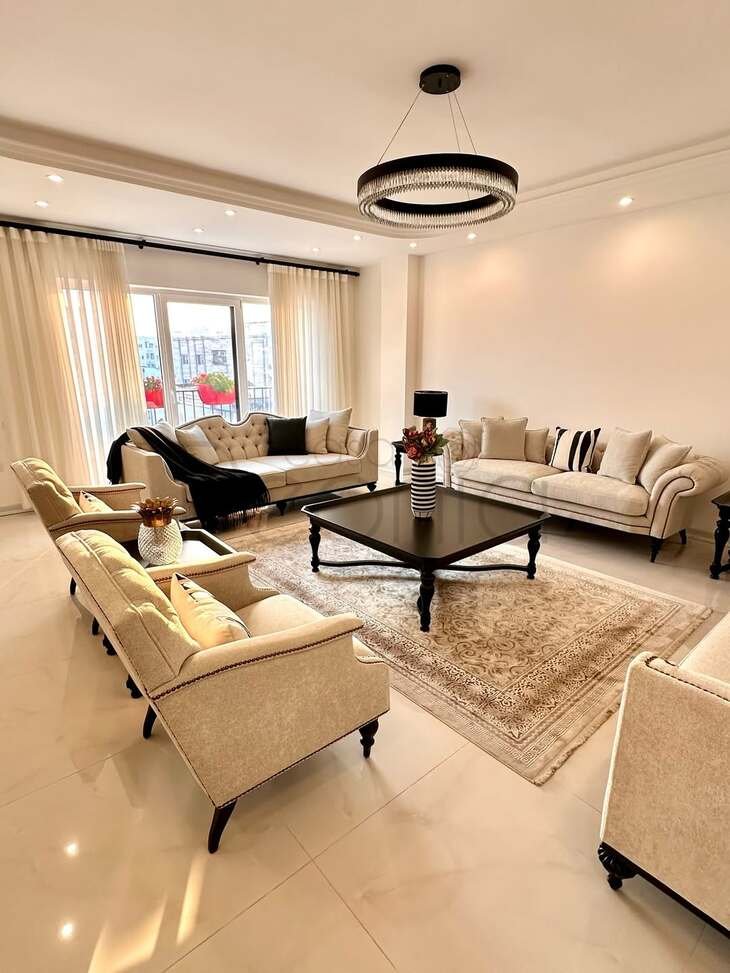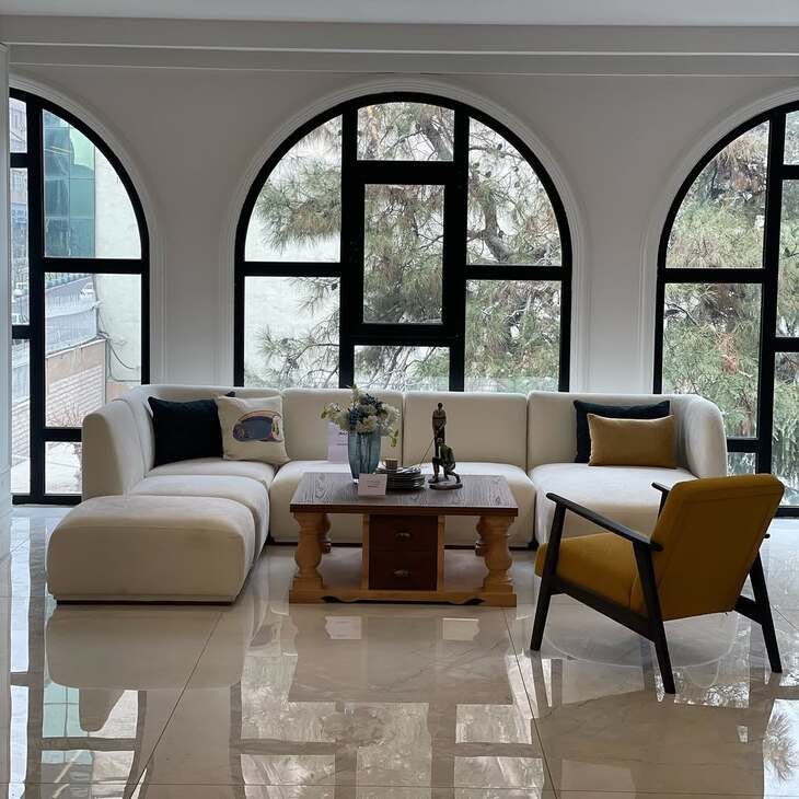 The thirteenth room feels like an old Mediterranean villa and a modern apartment had a baby. The arched windows are absolutely unreal. They frame the outside trees like living art. And the glossy light flooring living room tiles bounce that natural light around like crazy. It feels airy and quiet even though the furniture is a mix of modern and traditional shapes.