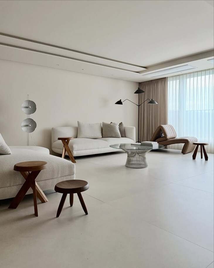 Idea fourteen is the minimalist cousin in this lineup. This light flooring living room is quiet, almost meditative. The furniture is all about shape rather than color. You have curved sofas, tiny wooden stools, a sculptural metal coffee table, and a long lounger by the window. The whole space feels like a peaceful gallery where everything is allowed to breathe.