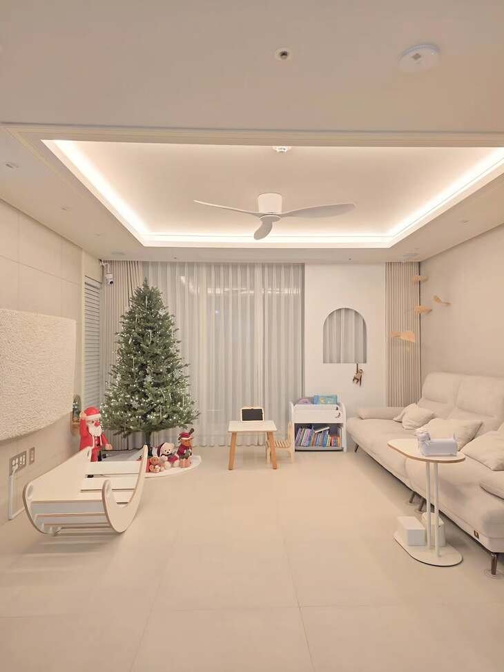 The sixteenth image feels like a cozy holiday snapshot. The light flooring living room tiles are matte and pale, which makes all the Christmas decor look extra cute. The little white sled, the tiny table, and the tree tucked near the curtain all feel playful but not chaotic. It is a kid-friendly room that still looks grown up.