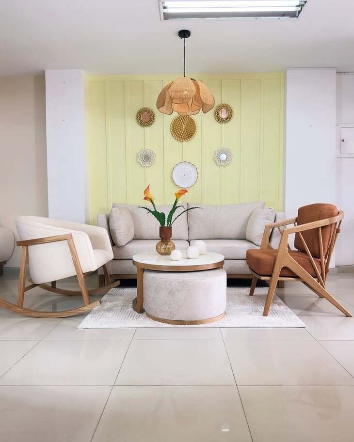 If your own living room with light ceramic floors feels empty, try this simple formula. One accent color on the wall, a set of matching cushions, and a small round coffee table with curves. The curves help balance all the straight floor tiles so the room feels softer and more relaxed.