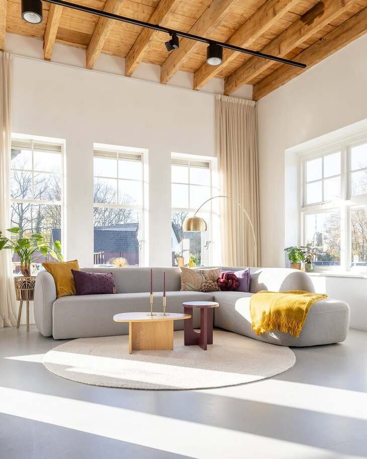 When I saw the fourth image, I literally saved it twice by accident. The combination of the wooden ceiling, tall windows and the subtle gray floor is just so calm. This is a light flooring living room that leans very Scandinavian, with a big curved sofa and a round cream rug right in the center.