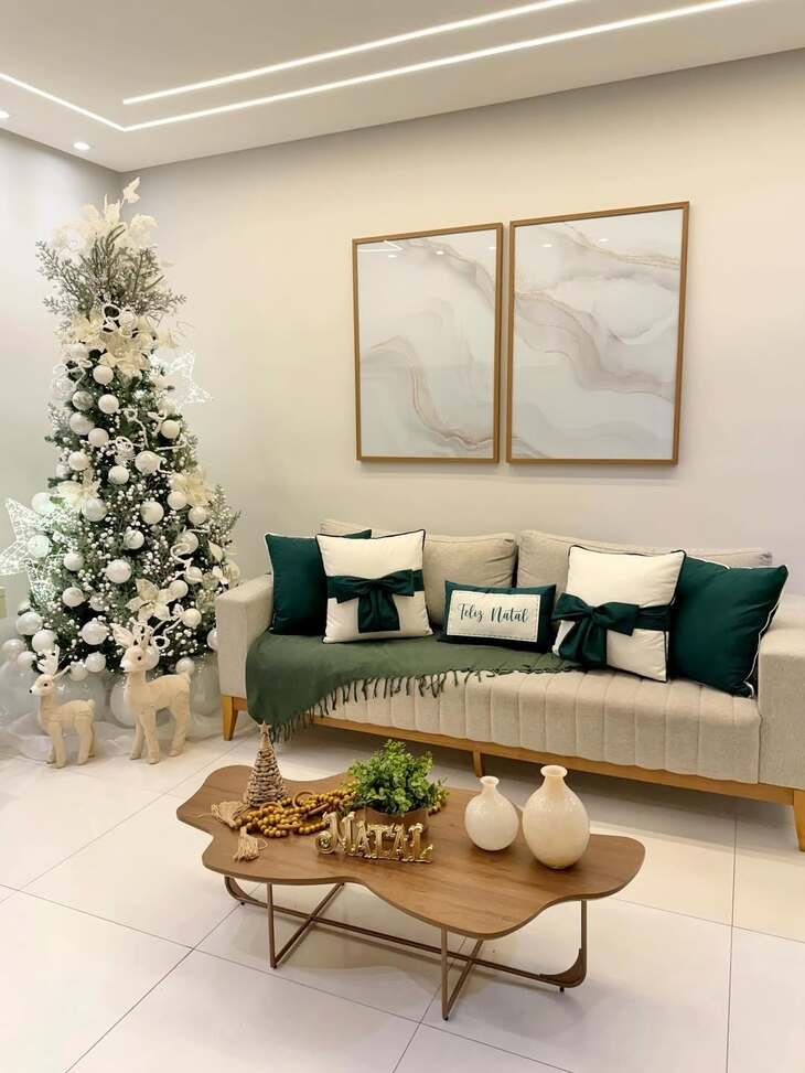 The fifth room made me want to put up a Christmas tree in the middle of July. The light flooring living room here is dressed for the holidays, with a white tree full of ornaments and a tidy beige sofa. The tile floor is glossy and neutral, which makes the green accents really pop.