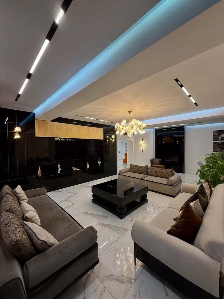 What could feel cold actually feels cozy, because of the soft sofas and the warm lighting. The ceiling strips with blue light add a futuristic touch, while the crystal chandelier keeps it fancy. If I ever had a modern living room with light floors and dark walls, I would copy this exact blend of warm yellow and cool blue lighting. It keeps the room from feeling like a nightclub or a hospital.