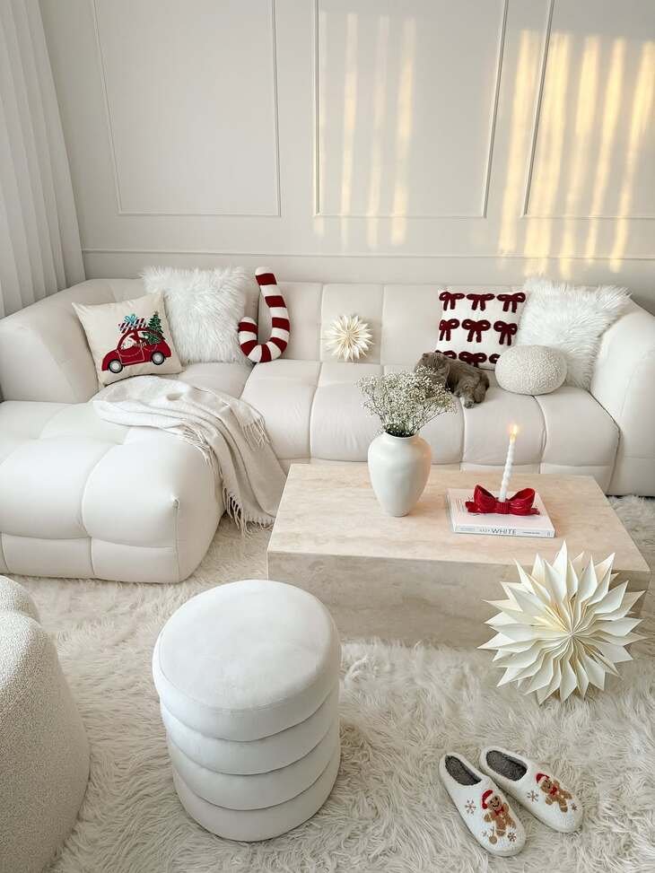 I usually worry that too much white will feel sterile, but here the mix of fluffy textures keeps it warm and cute. There are Christmas pillows, a candy cane cushion, and soft throws. This is a good example of a small living room with light floors where color is used very sparingly. Just red accents and a bit of beige in the stone coffee table.