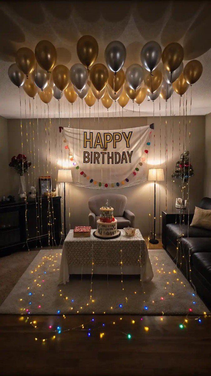 When I first encountered this living room birthday decor, I was struck by how effortlessly elegant it felt. The combination of soft lighting and celebratory balloons creates a truly inviting atmosphere for a special occasion.