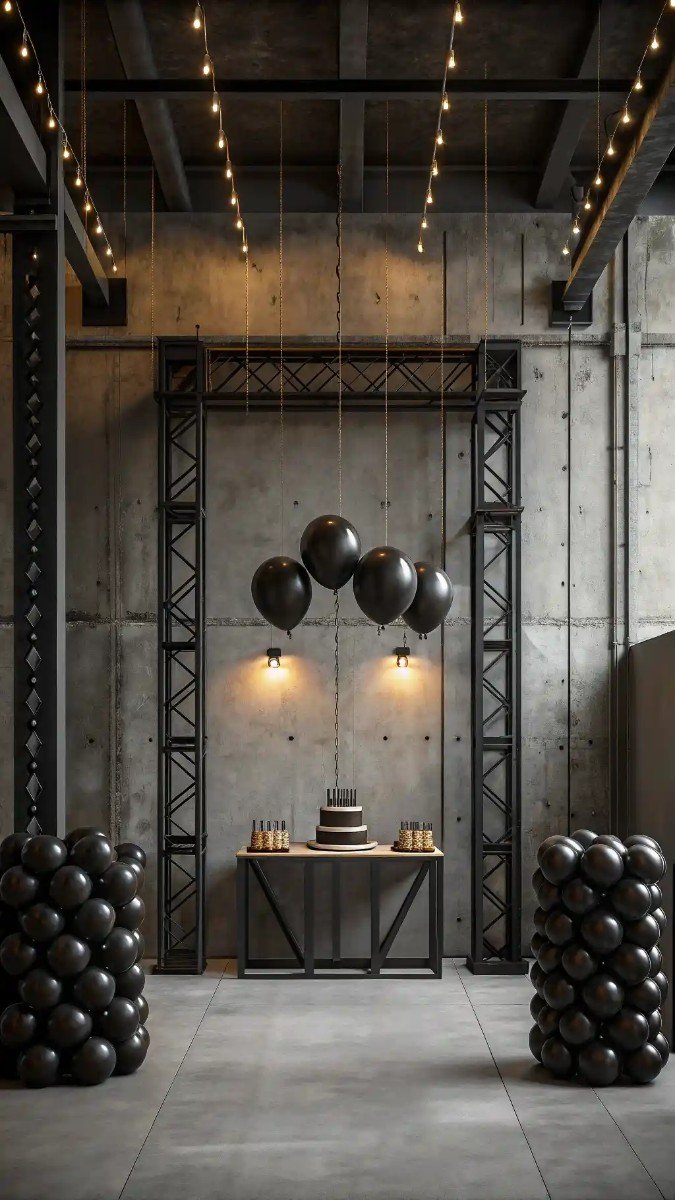 The use of black balloons and warm string lights against the raw concrete wall creates a striking contrast. This combination feels masculine and celebratory without being overly childish. The geometric metal frame adds an industrial touch, perfectly complementing the overall vibe.